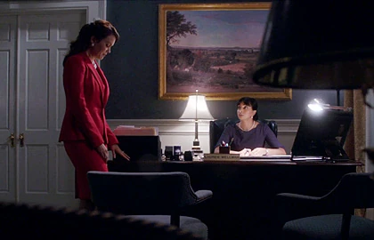 The President wants to talk to Olivia about her father, but she's not answering the Fitz Phone. At least, not at first. When she finally does pick up it's only to tell Fitz to stop calling her. Then she smashes the Fitz Phone to bits. Jake lets her know that's not going to stop him from calling. He's right about that one. Fitz sends Tom to get Olivia to meet him in Vermont, she tells Tom "No!" But after he gives her a picture that proves that Fitz knows who her father is she hoops on the chopper sent by Fitz. After Olivia yells at him in a Cyrus type rant, Fitz lets her know that the house they are standing in is hers. Theirs. He had it built for the two of them when it looked like they might actually have a chance at a normal life. He could never be mayor there, but she could make jam.